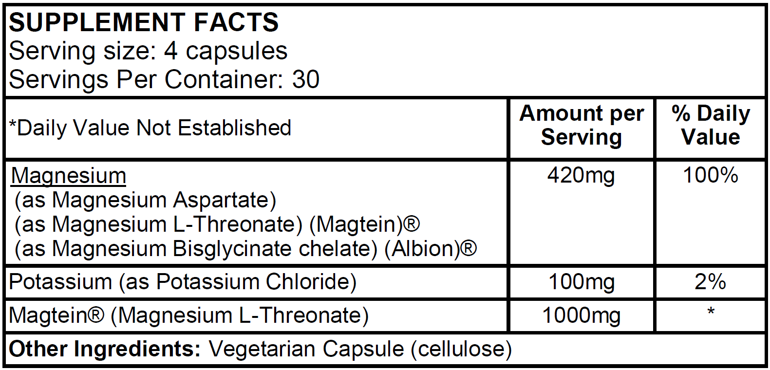 This formula contains Magnesium Aspartate, Magnesium L-Threonate (Magtein®), Magnesium Bisglycinate Chelate (Albion®), and Potassium to increase overall magnesium intake and for heart, nerve, and muscle function.