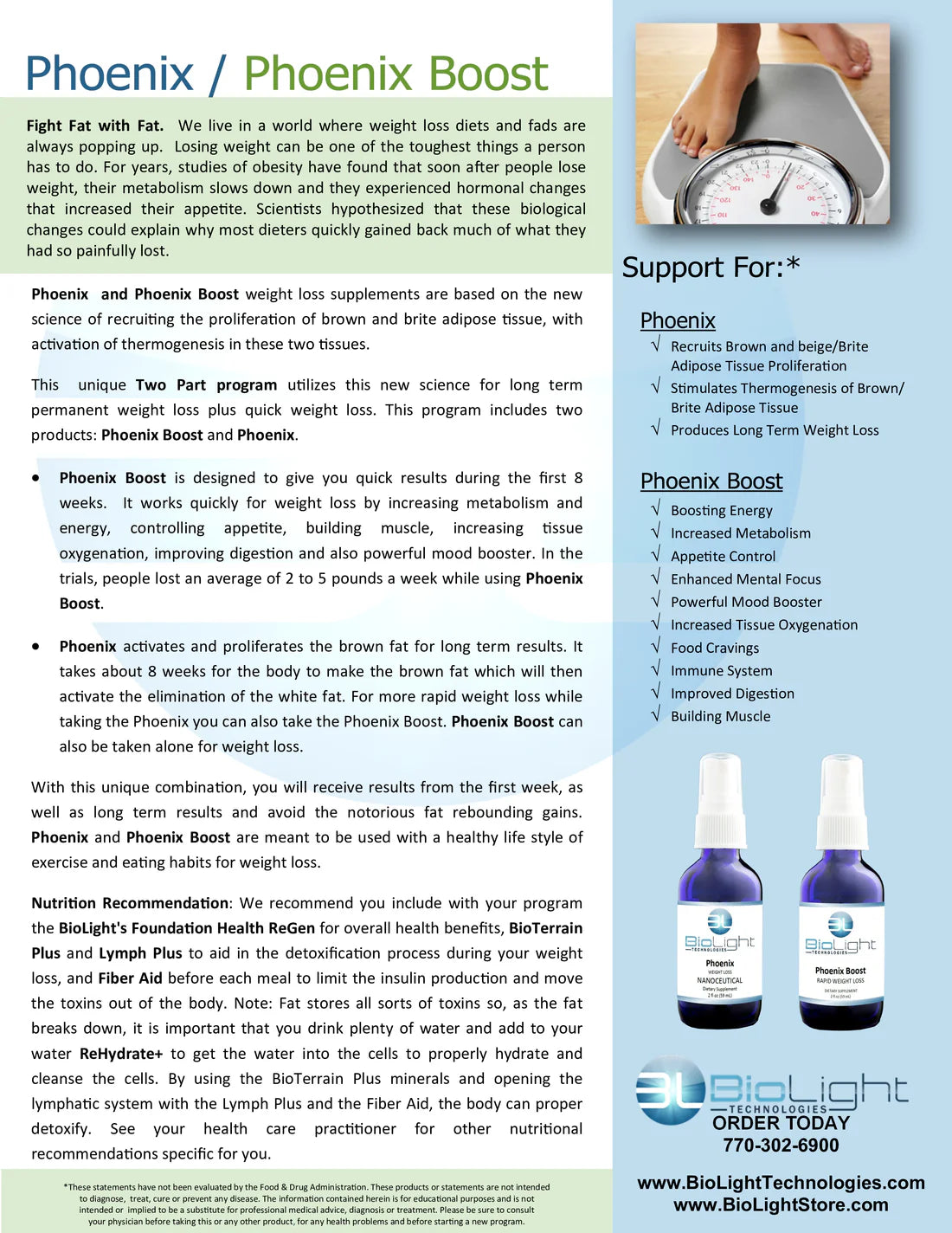 Dosage: Take orally under tongue, 4 sprays 3 times a day before meals. Phoenix Boost is meant to be used with a healthy lifestyle of exercise and healthy eating habits for weight loss. A healthy diet would include the reduction or elimination of all simple carbohydrates which include breads, pasta, chips, and the reduction of sugars and empty calories from sweets, candies, alcohol, etc., and the reduction of bad fats including soy, canola, vegetable oils, and excess animal fats (saturated fats). Good fats are mono-unsaturated and poly-unsaturated. We need good fats.