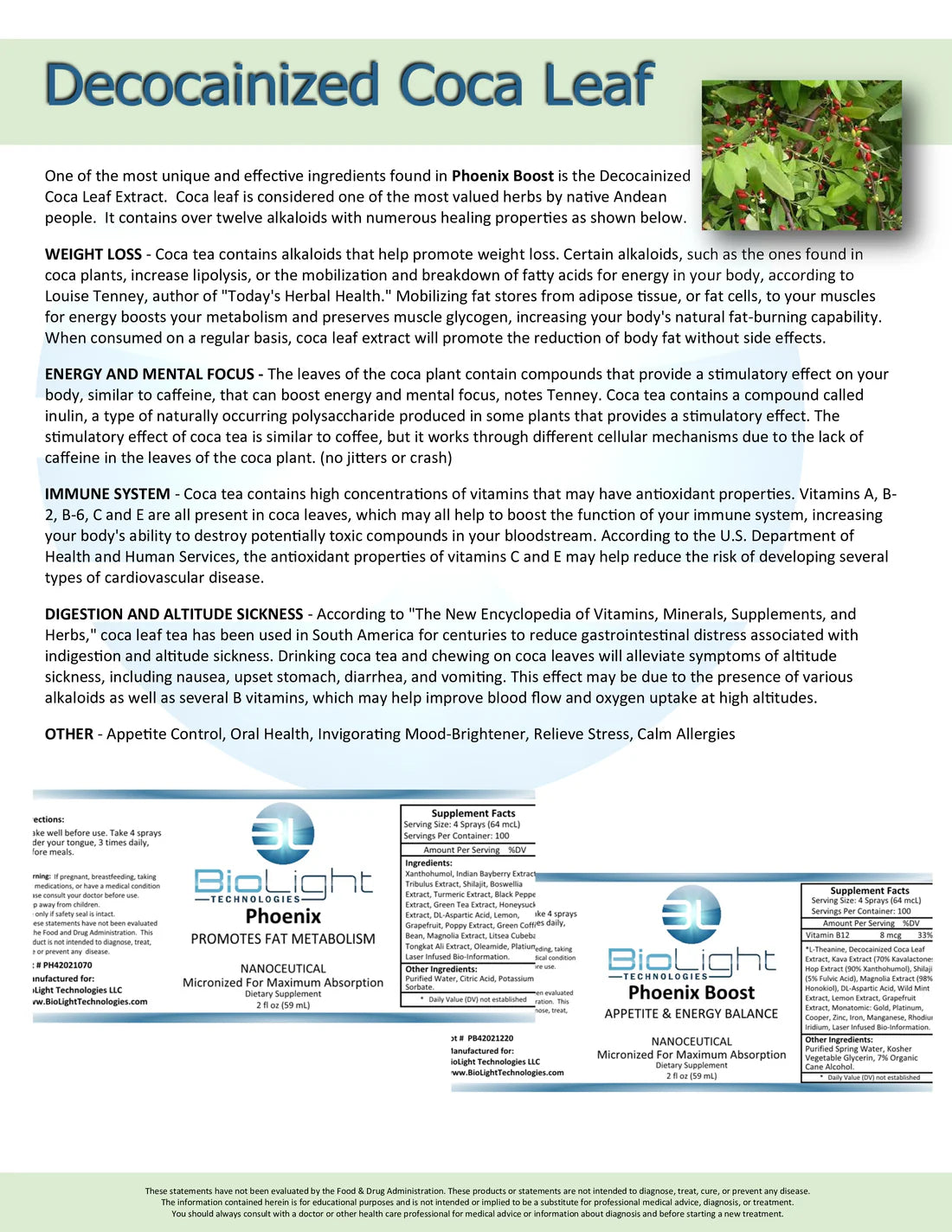 One of the most unique and effective ingredients found in Phoenix Boost is the Decocainized Coca Leaf Extract. Coca leaf is considered one of the most valued herbs by native Andean people. It contains over twelve alkaloids with numerous healing properties as shown below.