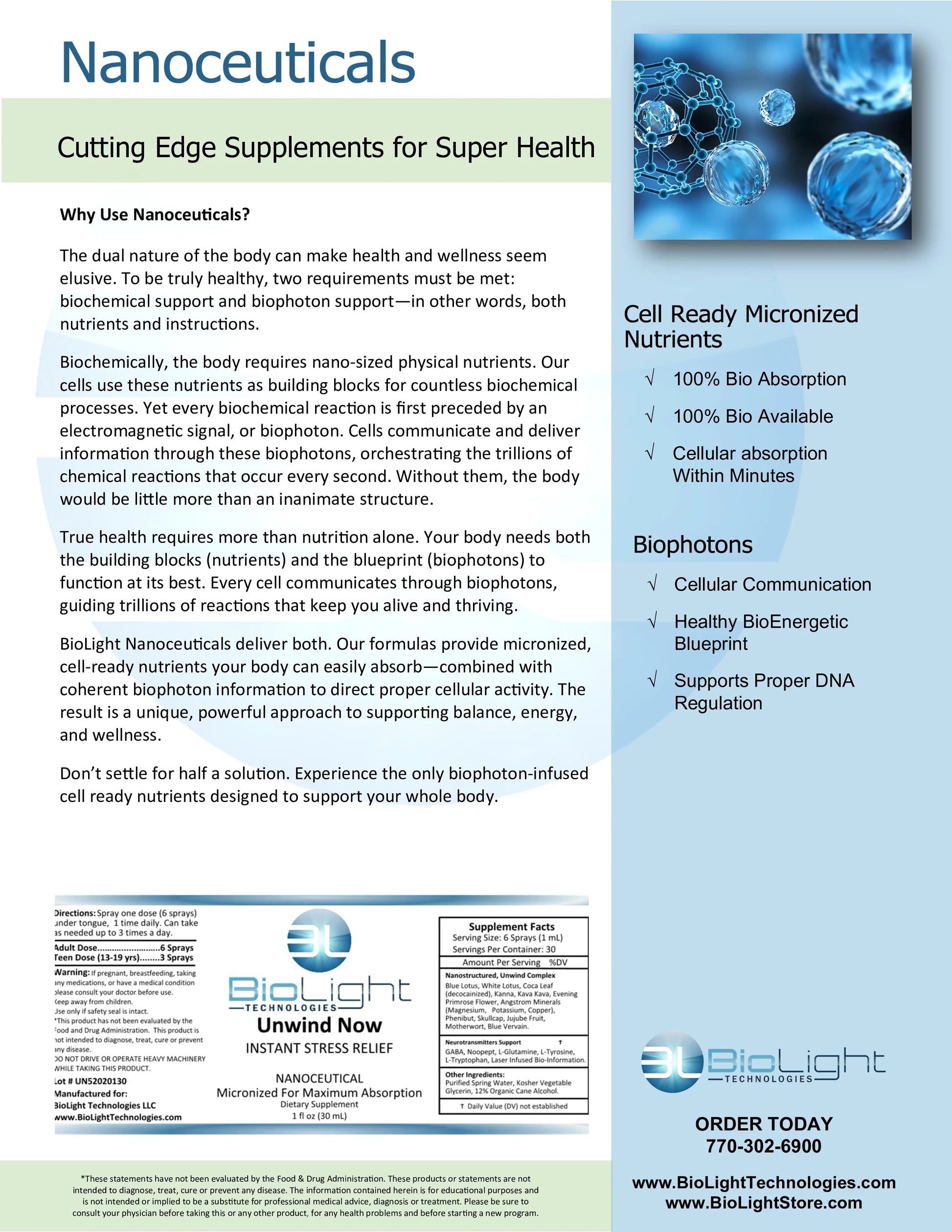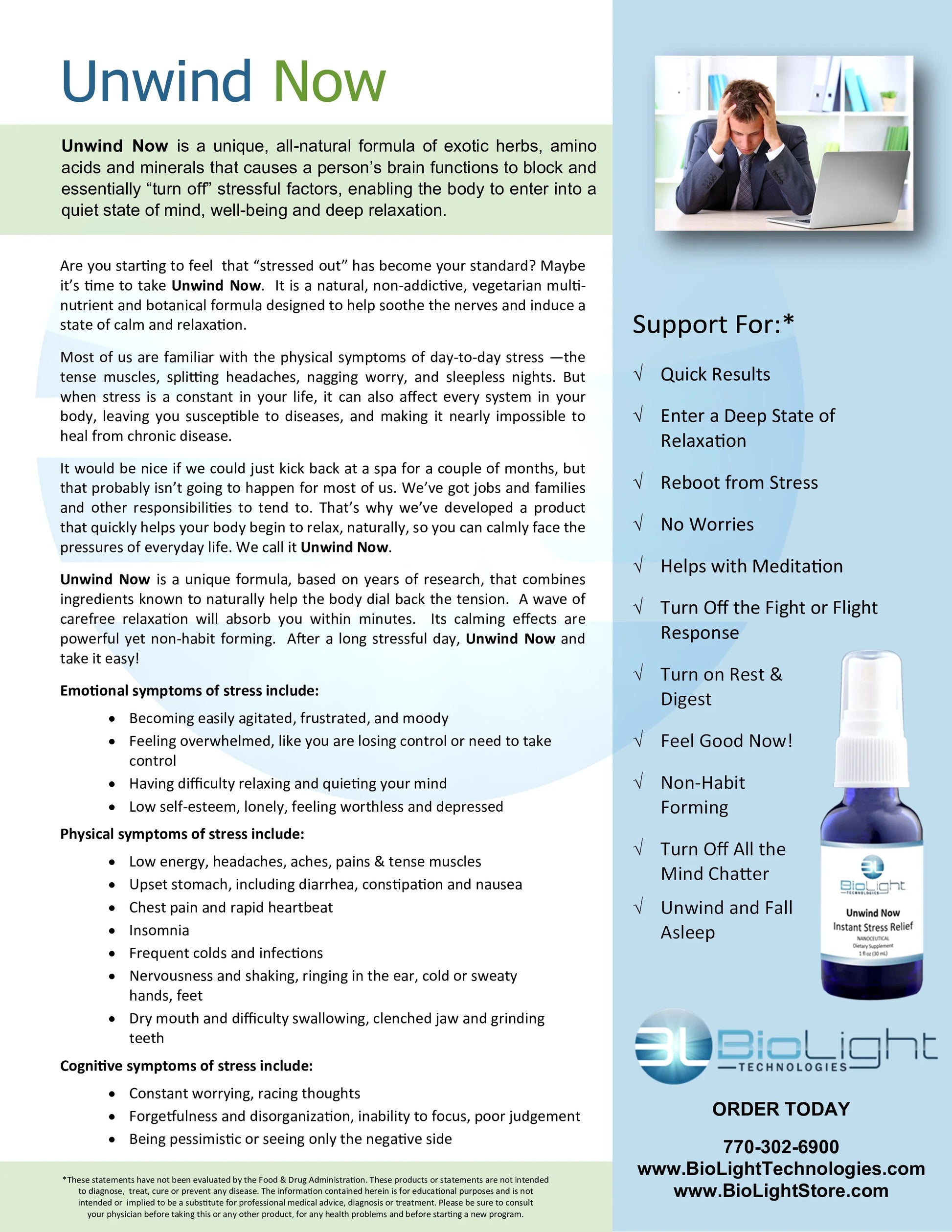 Anything we can do to keep ourselves in the “rest, digest and heal” mode as much as possible is worth the effort, since our long-term health may depend on it. Unwind Now was developed just for that purpose. It restores the body to a state of calm and counter-balance and allows it to relax and repair. Unwind Now, is a unique, all-natural formula of exotic herbs, amino acids and minerals that causes a person’s brain functions to block and essentially “turn off” stressful factors, enabling the body to enter a quiet state of mind, wellbeing, and deep relaxation. Click here for science document.